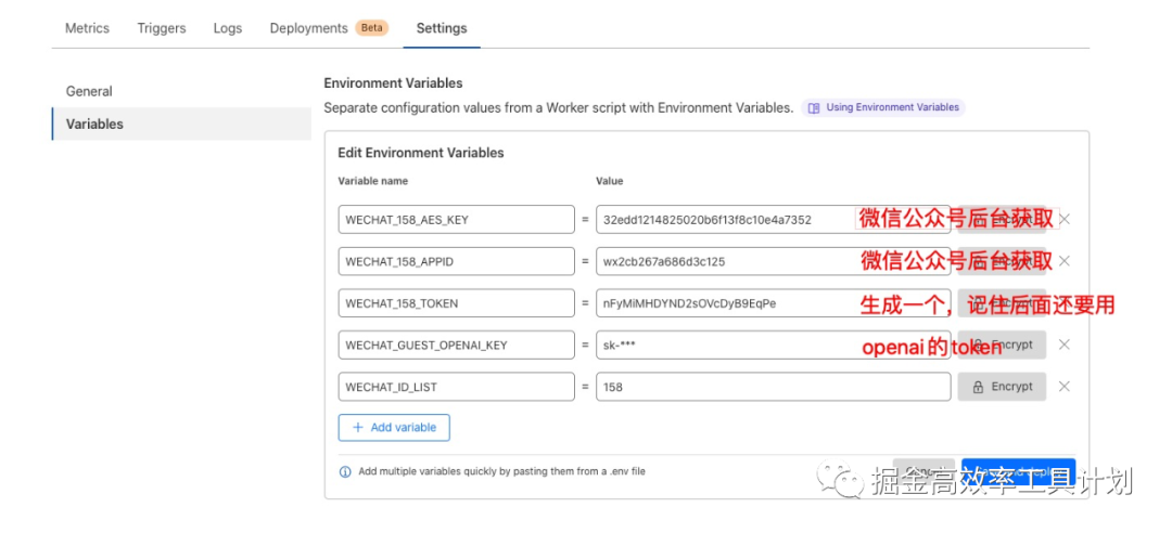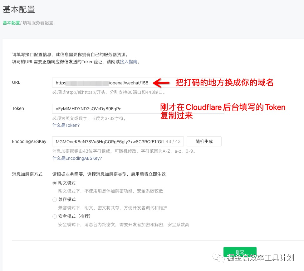 公众号后台添加配置,URL是你在cloudflare绑定的域名,完整域名为: https://xxx.com/openai/ wechat /158 如果保存没有报错,点击 启用即可