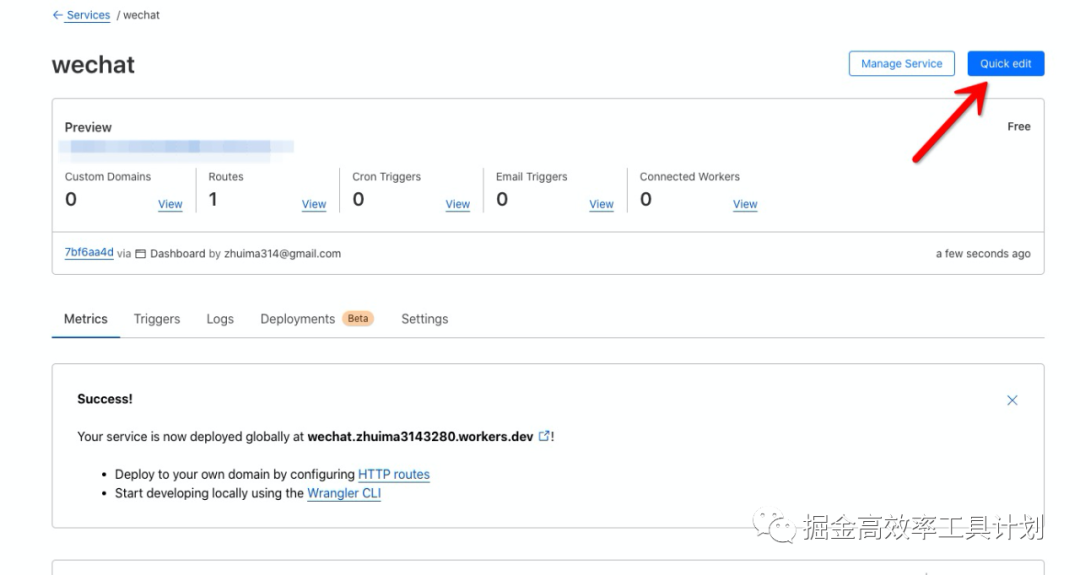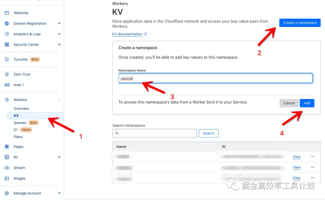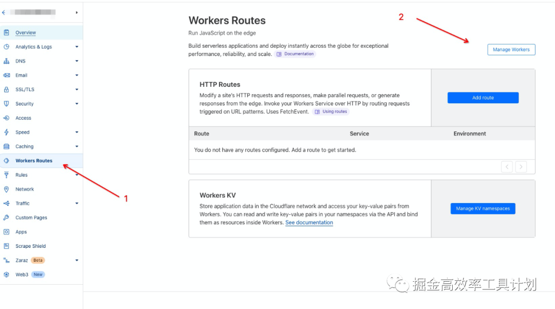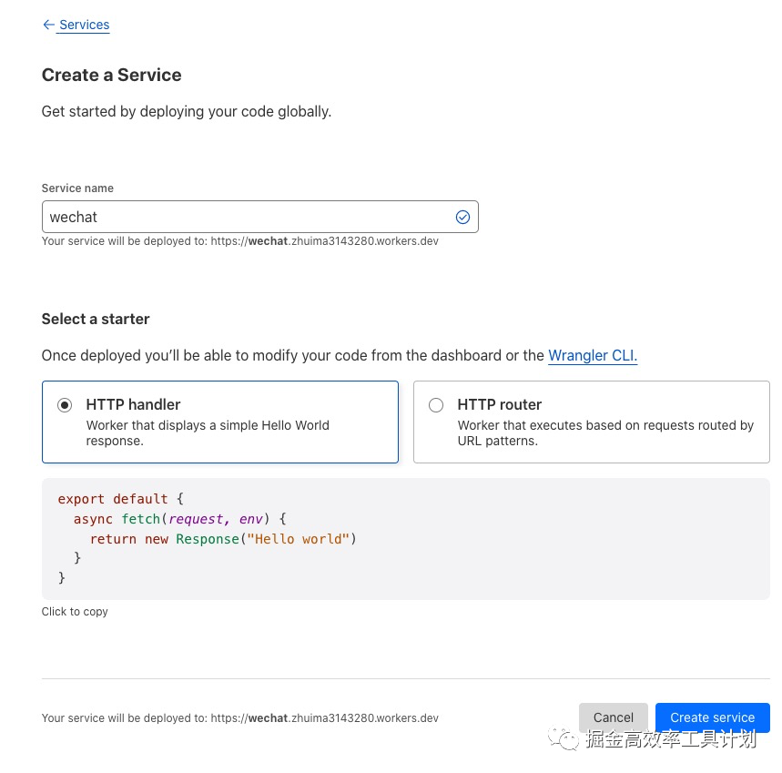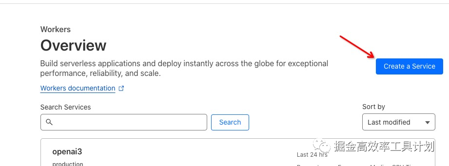 进入到之前绑定的域名里点击Workers,创建Service,请按下图指导操作