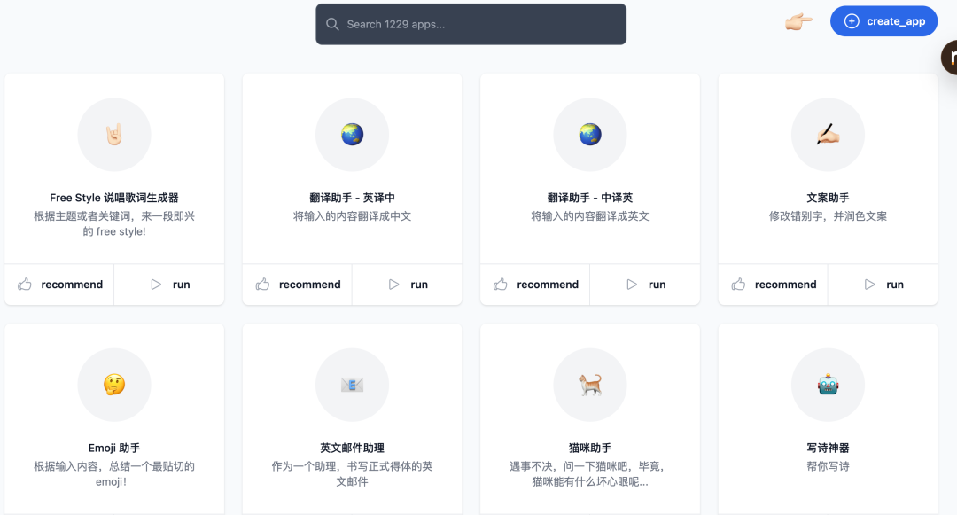 最近发现一个很不错的 AI 应用生成网站: https://open-gpt-app.vercel.app ,网站的描述简单粗暴:Create ChatGPT Application in seconds。在写这篇文章的时候已经有 1229 个 App 了,比如:翻译助手-英译中/中译英,文案助手(修改错别字以及润色文案),英文邮件助理(帮助书写更得体的英文邮件),还有很多其他功能的 App,感兴趣的可以自己去搜索。