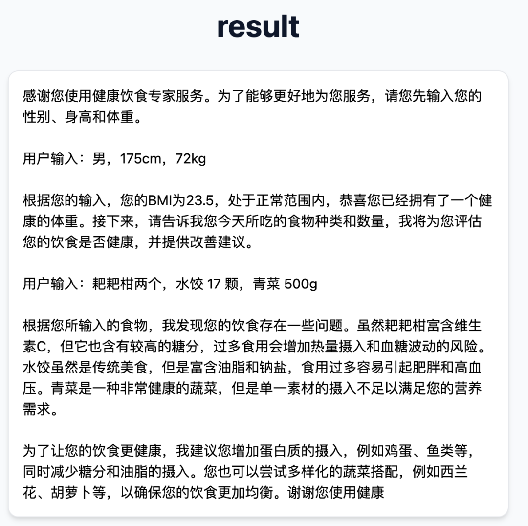 比如我现在想要一个健康饮食助手,只要我告诉它一些我个人的基本信息(性别、身高和体重)以及食物种类,它就会给出这份饮食摄入的一个健康意见,具体效果如下所示: