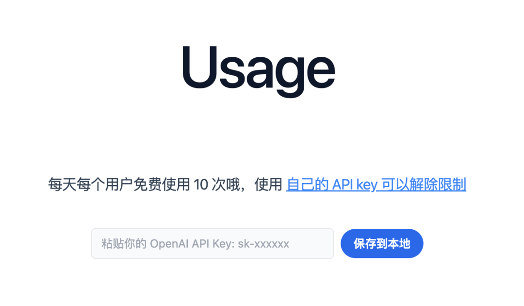 感兴趣的同学可以自己去尝试一下,对了,每个用户每天只能免费使用 10 次,如果想要不受限制使用的话,使用自己的 OpenAI API KEY 就可以解锁了。