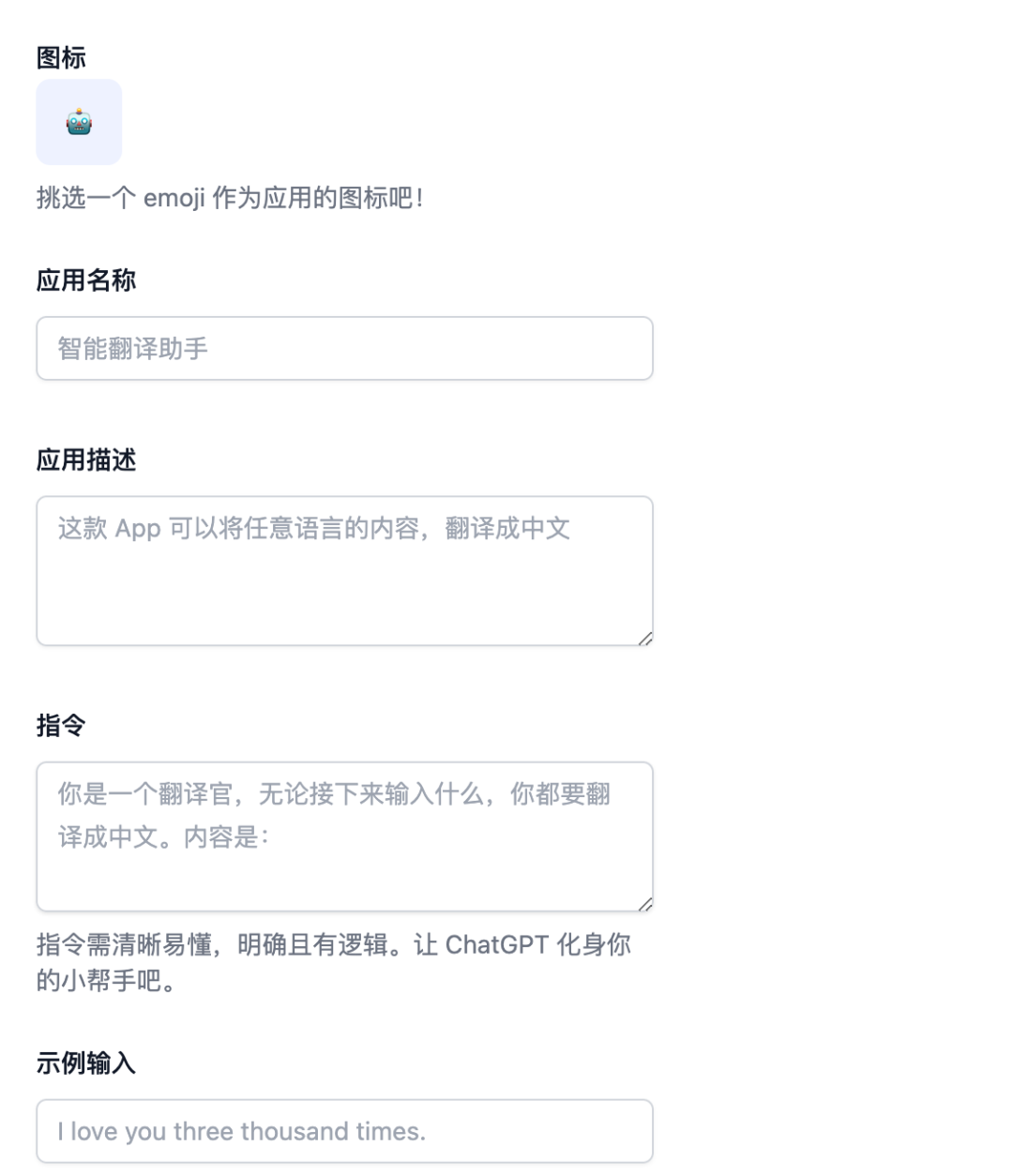 当 然,你也可以根据自己的需求,去创建一个新的 App,需要的信息也很简单: 应用名称、应用描述、指令和示例输入,页面如下图所示: