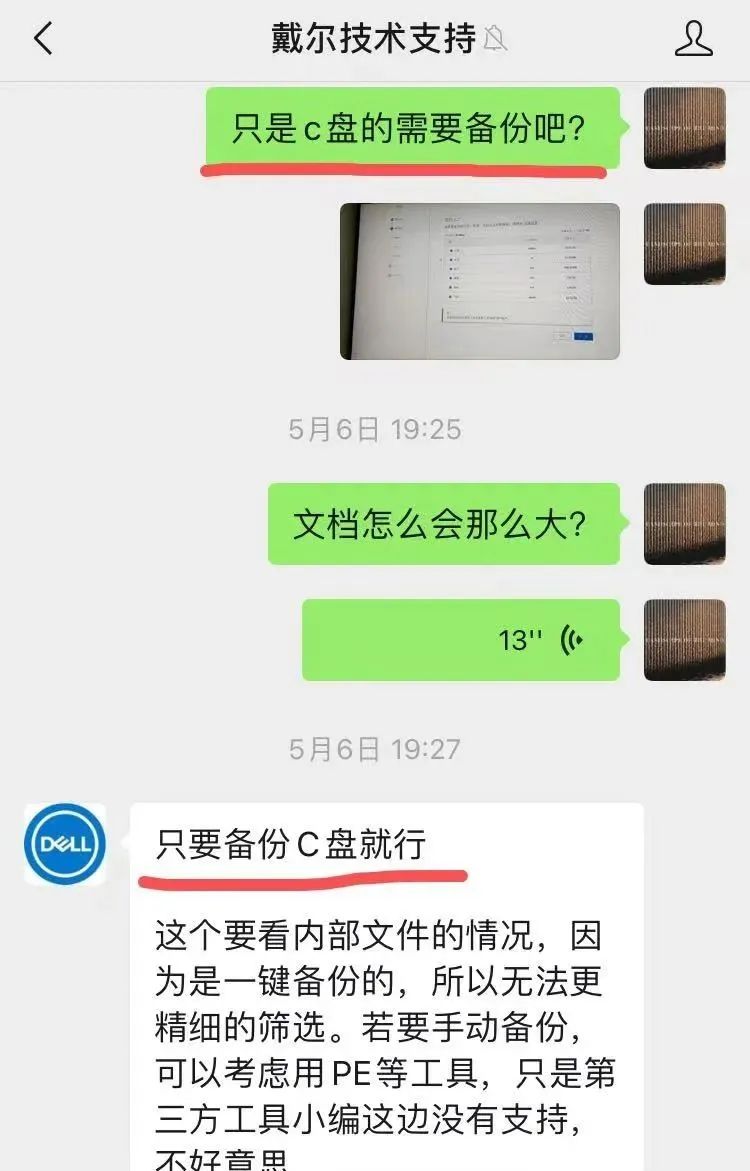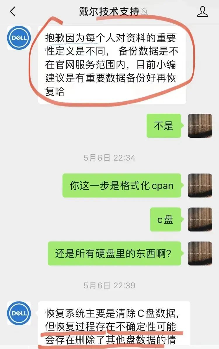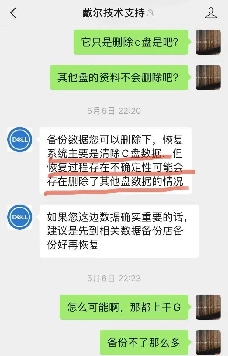 因为从来没有进行过电脑重置,当看到“永久删除硬盘上所有系统数据和个人文件”这样的字眼时还是有些紧张的,于是再一次和DELL的技术小编确认,这时他的回复如下(而这样的回复也一下子让  我陷入了   两难的境地)。