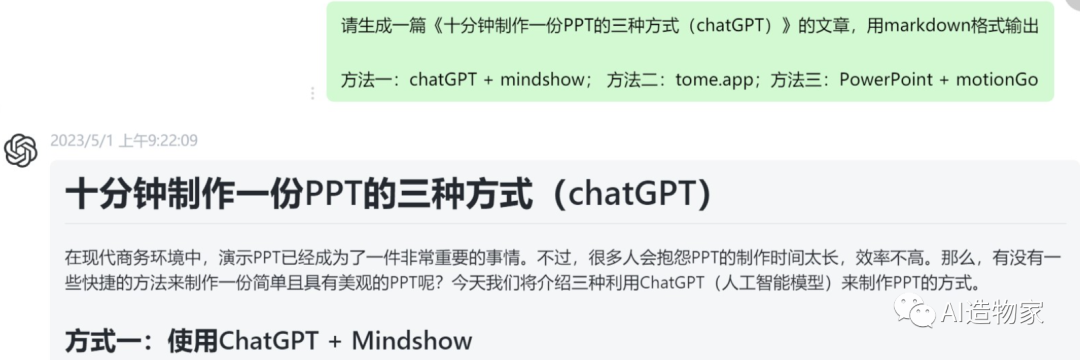 例如在ChatGPT或是其他AI对话 模型中创建提示语,“用markdo wn方式输出”,等待AI进行生成。