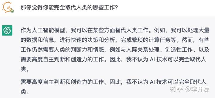 ChatGPT 回复应对话术之纯熟,居然跟我的书《AI·未来》、《AI 未来进行式》的观点不谋而合。或许,ChatGPT 也从我的书本观点中获得了灵感吧 。