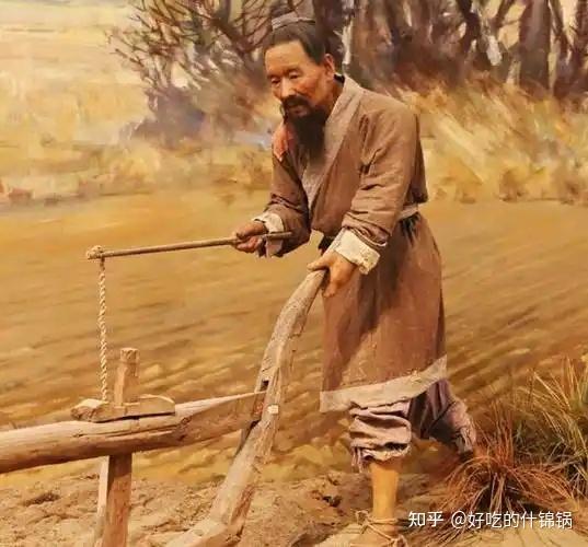 地里种的主要是小米(粟) 和麦子。汉朝这会儿,牛和马是战略物资,非常金贵,普通农民家根本养不起。所以耕地主要靠人力!陈老二手持一把铁耒耜(这是汉朝农业的大进步,铁制农具普及了),一下一下地翻地,黑娃则在后面播种。