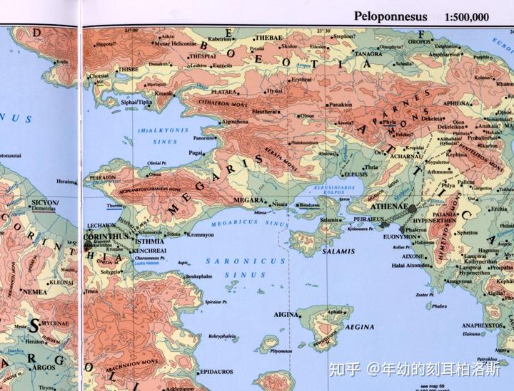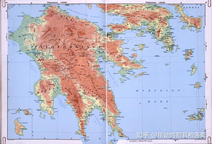 这本地图集上一大半的地图都是 1: 500,000 的。虽然绝大多数城市都只能用点来标注,但一些大都市经过勘察后的范围占据了一片灰色区域,比如希腊的雅典和科林斯。