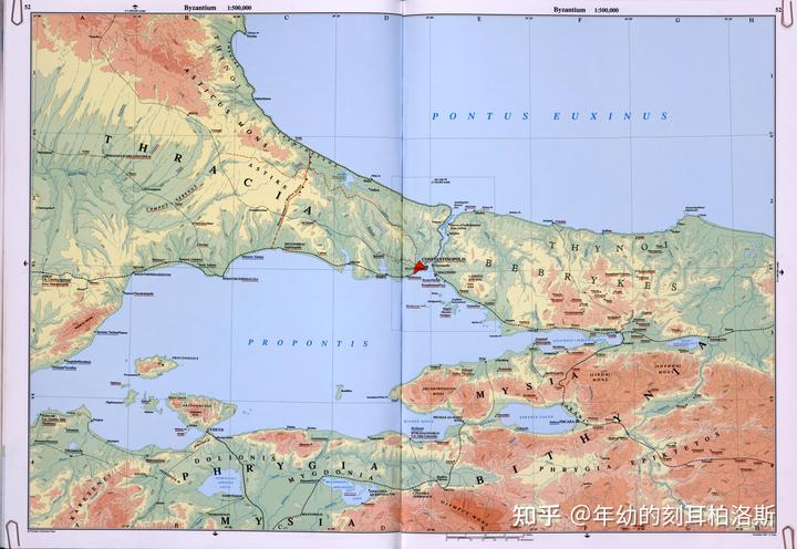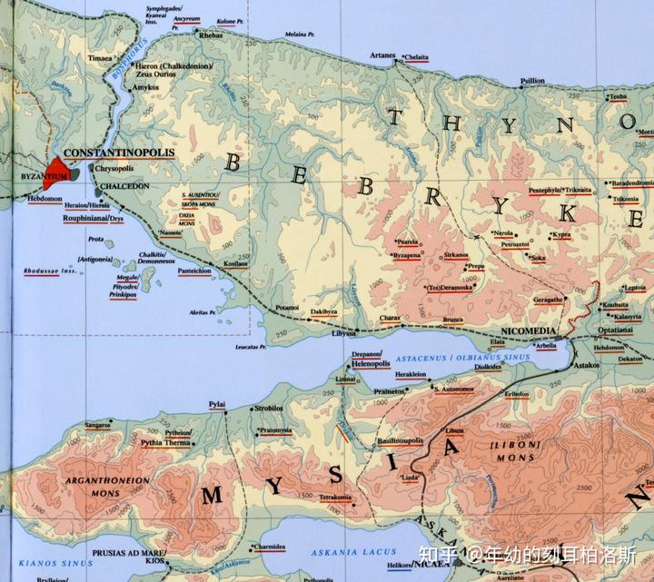 局部,君士坦丁堡(迪奥多西城墙范围内标红)、查尔西顿、尼科米底亚、尼西亚。