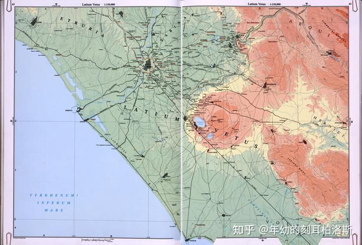 巴灵顿古代希腊罗马世界地图集中,有一幅 1:150,000 的大比例尺老拉丁地图,可以直观看到罗马城和其他拉丁城市的规模。原图中罗马城区域只用红线画出了后来的奥勒良城墙范围,我就自己 p 了一个塞维乌斯城墙覆盖的灰色区域上去,位置稍有不对(偏北,懒得再改了),但面积问题不大。虽然城墙内面积并不等同于实际城市面积,但也可以看出罗马城从共和国初期(早期城市范围变化详见罗马城的聚落形态经历过怎样的变化?)到帝国全盛期的变化,以及罗马与其他拉丁城市的规模对比。
