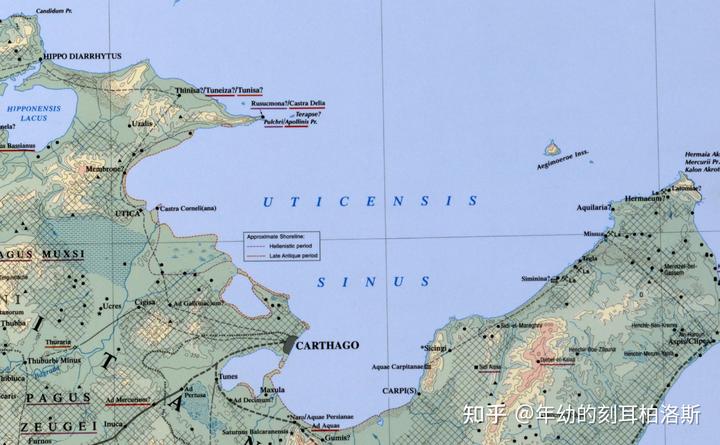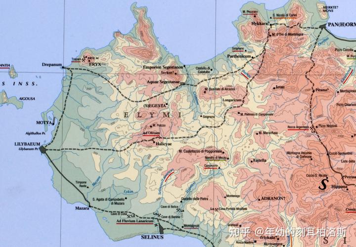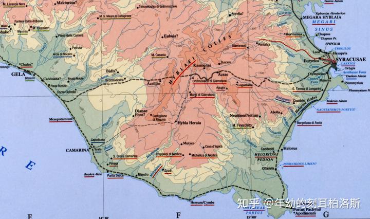 西西里的叙拉古、麦萨那、帕诺姆斯、阿格里真图姆、利利拜乌姆等城市也用灰色区域表示。