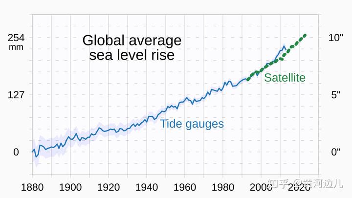 下面这张图是自 1880 年以来全球平均海平面的变化趋势。蓝色曲线代表潮位计的长期观测,绿色虚线代表近几十年更精确的卫星测量,两者都显示海平面在持续上升。