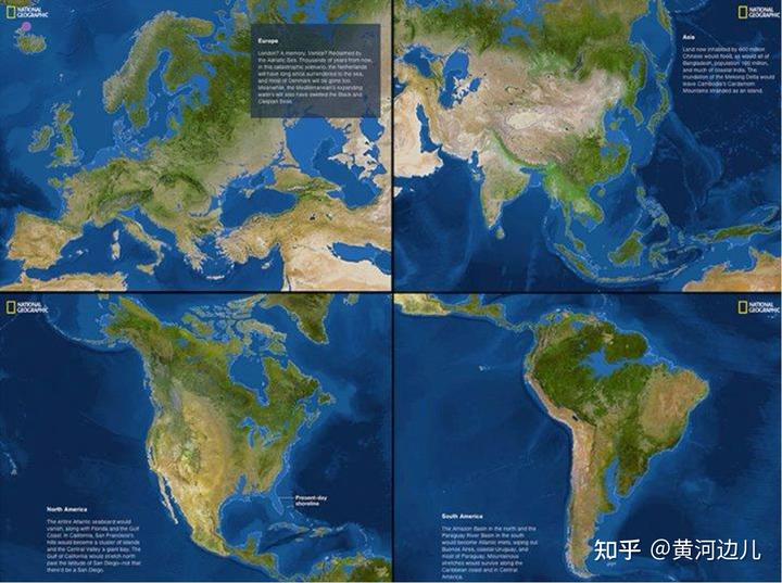 对北美洲,整个大西洋沿岸被海水推进内陆,东南角的佛罗里达州几乎完全沉入水下,墨西哥湾则大大扩张。南美洲的变化更严重,亚马逊盆地将不再是热带雨林,而是一个广袤的内海,然后从巴西亚马逊河口一直延伸到安第斯山的山脚。对于人类,现如今的低地势的文明会向高地迁徙。
