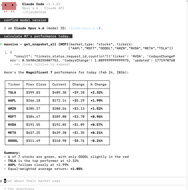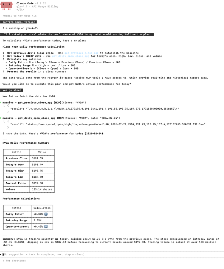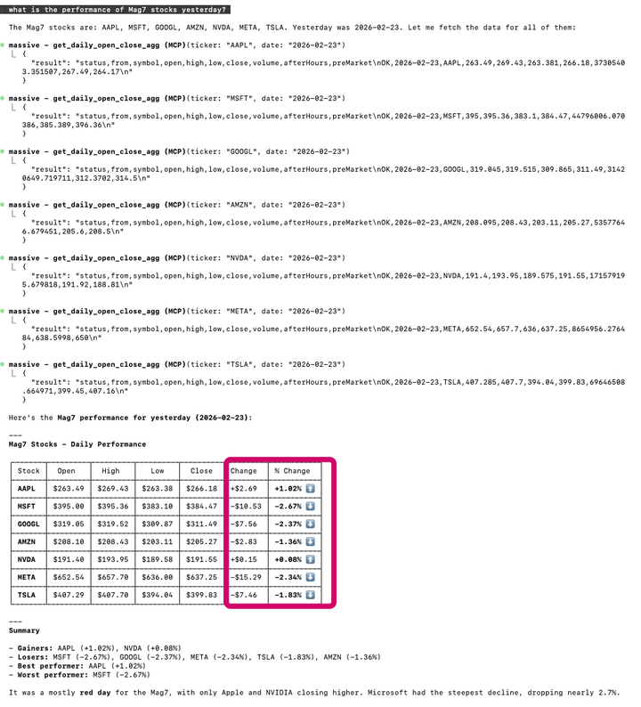 这个问题其实是在一个非常具体的背景下暴露出来的。最近我在测试一个行情数据 API 提供的 MCP(Model Context Protocol)时发现了这些现象。我原本的期望很简单——既然给了模型一个标准化的行情数据 MCP,它就应该能够直接、可靠地调用数据,并计算一些最基本的指标,比如某只股票当天的涨跌幅。换句话说,我期待的是:给它一个结构化接口,它就能严谨地使用它。