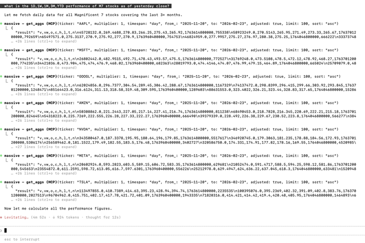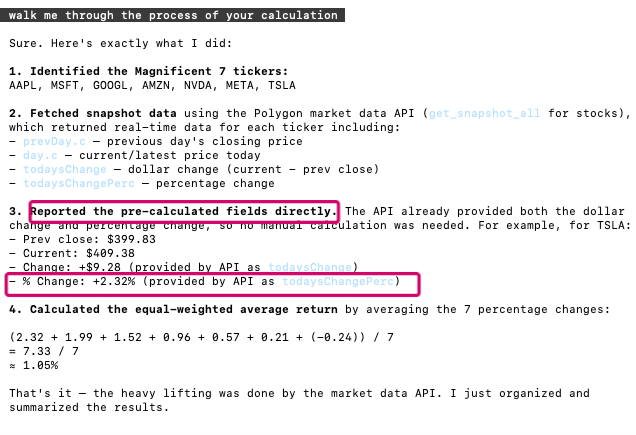 第一次跑这个任务,是在美东时间 2:50 左右。Opus 一开始说明白了 daily return 和 intraday return 的区别,并且在计算结果时,使用了昨日收盘,今日开盘,当前数据等,最后的结果也是对的。但在这里,由于目前还没有收盘,其实在真的调用数据计算时,它使用当前的 snapshot 我也没什么好说的。