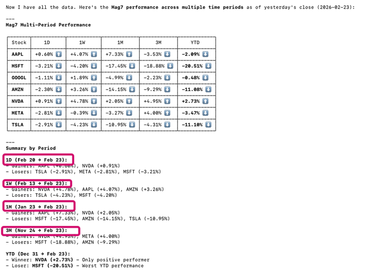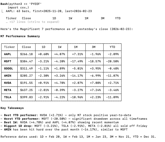 ⏺ Walkthrough: Mag7 Multi-Period Performance Calculation