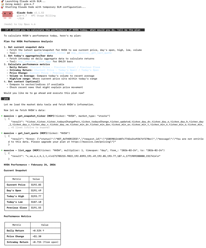 仅仅给模型一个行情数据 MCP,并不足以保证它能稳定、严谨地完成金融计算。若希望在量化场景中可靠使用,仍然需要在模型之上增加明确的 skills 或 wrapper——把收益口径、字段映射、时段规则、交易日历等逻辑写死、封装好,让模型调用的是经过约束的能力,而不是自由发挥的理解。