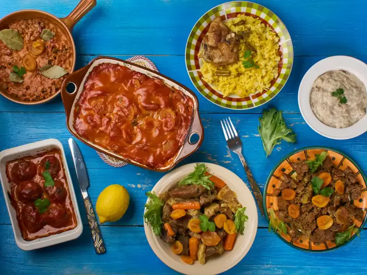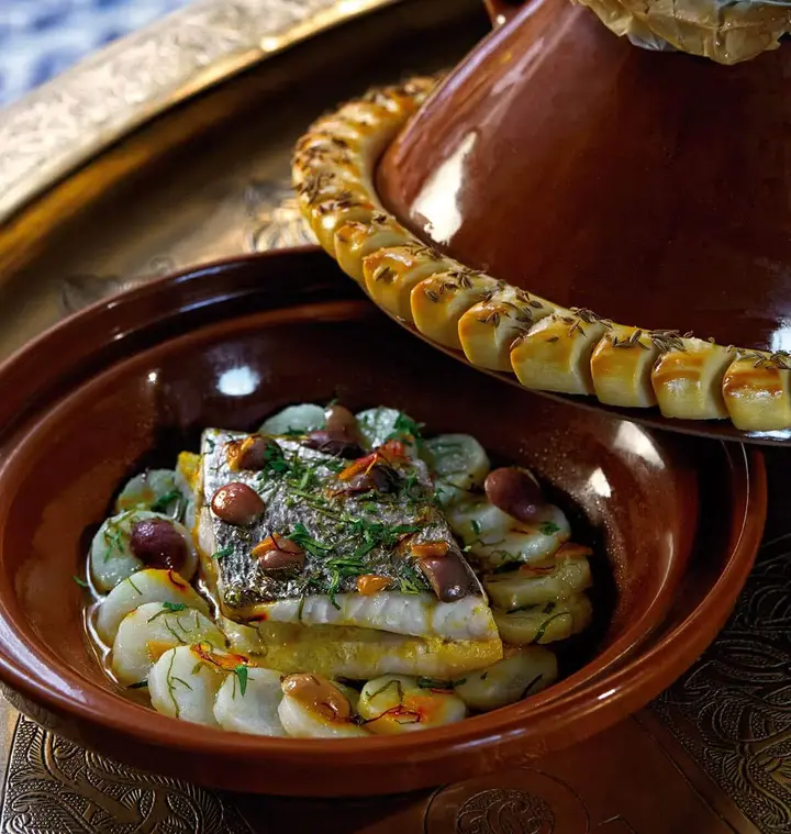 摩洛哥是北非最具饮食文化影响力的国家。摩洛哥饮食融合了阿拉伯、柏柏尔、安达卢西亚和地中海饮食的传统,也受到欧洲和撒哈拉以南地区的影响。塔吉锅是摩洛哥最具代表性的烹饪器具,这是种带着尖顶盖子的陶制砂锅,其独特的设计,可以让水蒸气不断在锅内循环,最大限度的节省用水,保留食物的原味,非常适合北非干旱少水的自然环境。
