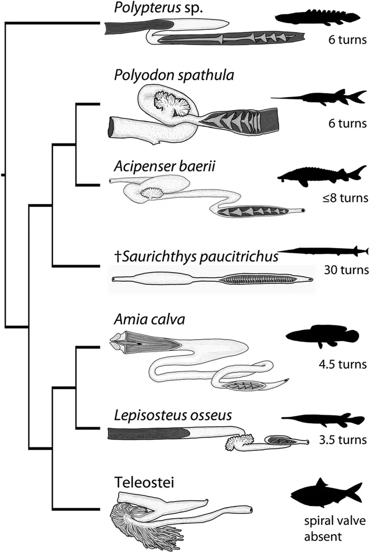 例如,肉食性鱼肠道较短,草食性鱼肠道较长,肠的第一部分具有螺旋瓣,从而进一步增加消化面积[3]