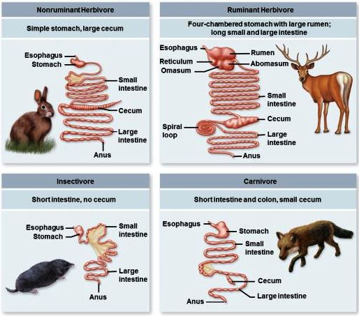 草食性和肉食性动物的肠道,同样具有一个更长、更复杂,一个更短、更简单的区别。