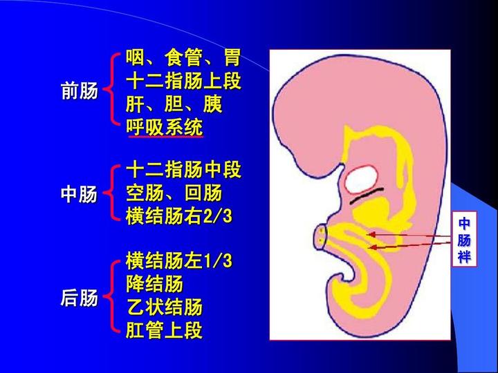 其中,前肠分化为口咽、食管、胃、十二指肠上段,肝、胆、胰等配套器官,以及肺部为首的整个呼吸系统。