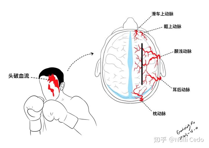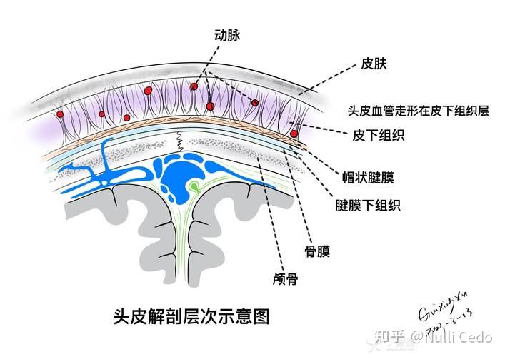 头皮的血供主要来自于颈外动脉,血供丰富、层次紧密、易大量出血,主要血管为 1-3 毫米直径