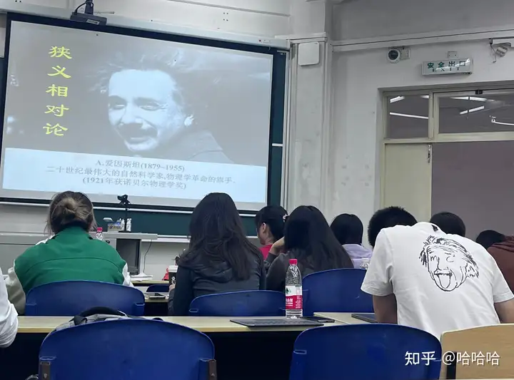 讲狭义相对论的时候前面男同学恰好穿的很应景