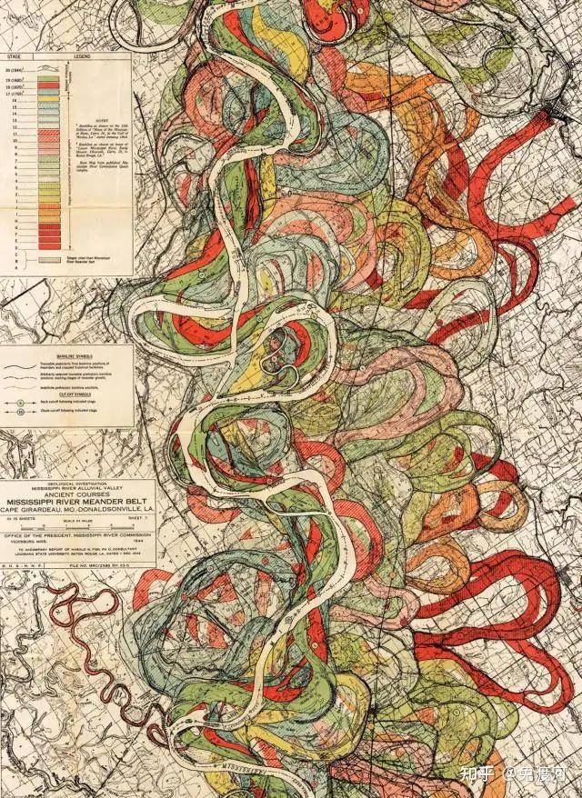 地质学家哈罗德菲斯克,1944 年绘制了密西西比河从密西西比州弗赖尔斯 - 波因特(Friars Point)到甘尼森(Gunnison)的 40 英里河道。