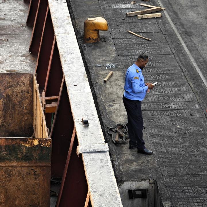 保安大哥的英语水平,比锚地那些开着快艇,在各国商船间搞贸易的小商贩差多了,只能用夸张的动作,混合着波斯语和简单的英文,来跟我急切地形容着昨天晚上发生的事:「嗖嗖嗖,到处都是炸弹,头上戴着圈的那个人死了。」