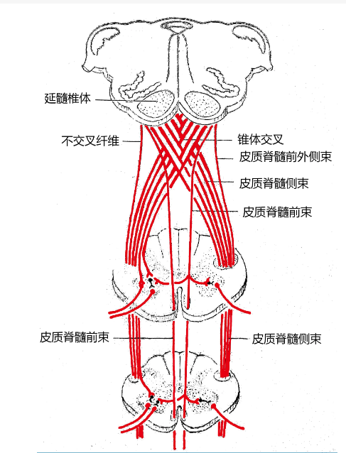 另外还有剩约 10%的神经纤维[2][3],则沿着前皮质脊髓束继续传递信号,最终完全不会交叉。