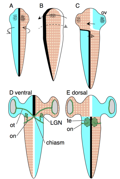 这个理论认为,因为视网膜成像倒置,所以需要视交叉交换上下左右视网膜信息,使得大脑皮层重新拼接,得到一个连续的视觉地图。