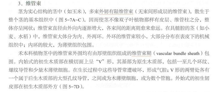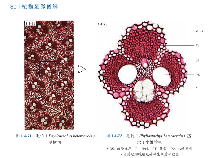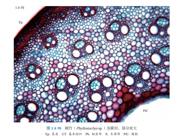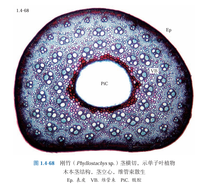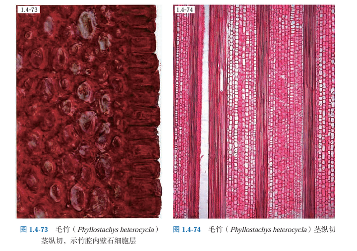 比较细的竹子会形成比较完整的一圈维管束,较粗的竹子则是比较散列的形成一圈维管束,越靠近外侧竹青维管束越多,靠近内测则逐渐减少。而且禾本科的维管束比木本的维管束结构更复杂,维管束外还有维管束鞘对几条维管束包络增强。这些维管束和木质部一起形成类似钢筋水泥的加强结构,这样的维管束微观结构比木本的维管束强度明显增强,代替了树木形成层,轻量化的同时满足了强度和刚性。