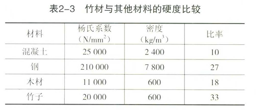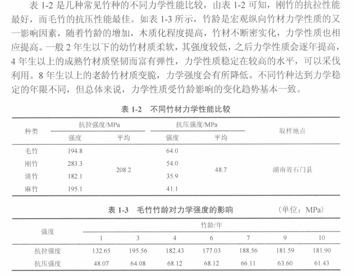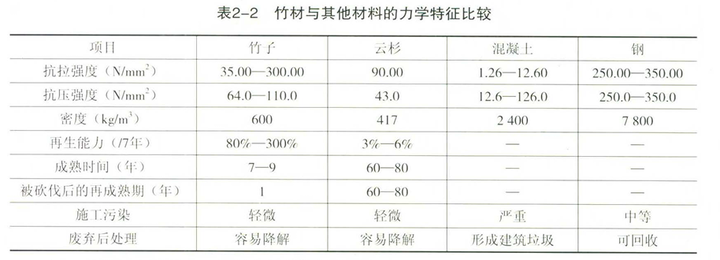 下面几张表可以看到,竹子的好几项力学性能接近混凝土,但密度、重量、成本却远低于其它建材。