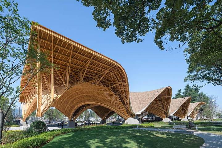 下图是 2025 年日本大阪世博会日本馆”蓝色海洋“,因为不允许使用原竹施工,日本的设计施工人员,对原竹用了与中国馆不同的重构工艺,使用了新的竹原料的复合竹材。