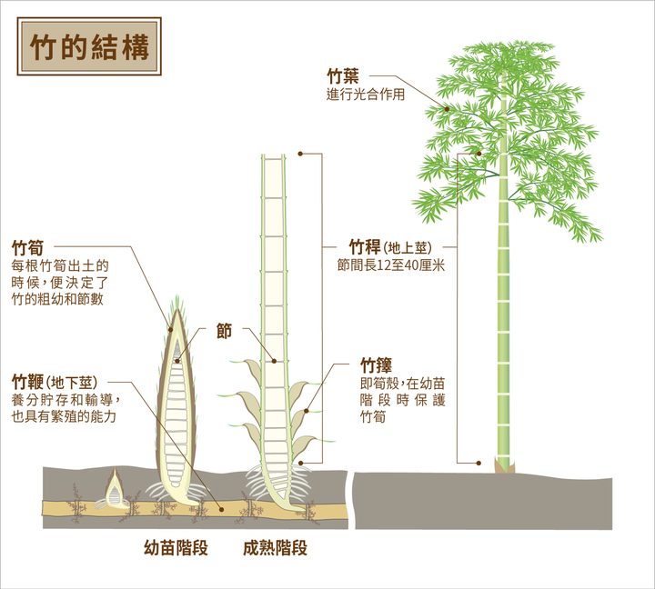 - 生长方式:由地下横走的竹鞭(根状茎)发育而来,与草本植物的分蘖方式相似,而非木本植物的直立主根。(这一生长方式下一个子问题会进一步讲解)