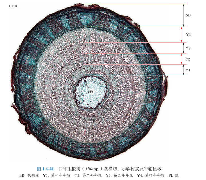 下图是四年生椴树茎横切标本,可以和前面竹茎秆标本对比。