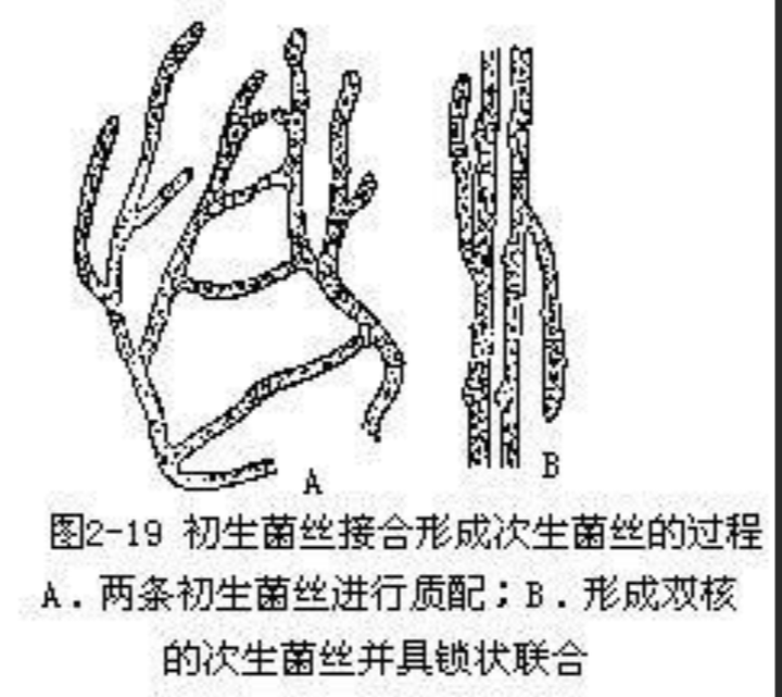 于是以单个菌丝为代表的初级菌丝们通过细胞质的融合形成锁状联合(clamp connection),最后组合成双核状态,这被称为次生菌丝。