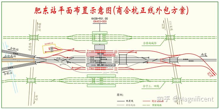 而合肥往南,也就是京港高速线合安段,就没那么好运了。由于彼时合肥南暂无改造规划(甚至连合肥南线路所都懒得搞定),导致合安段只能通过既有线接入合肥南。最终选择的是借宁蓉线引入,至于为何不选择合福场,很大程度上是考虑到无砟轨道板拆除和正线拨接很麻烦,中断正线时间很长。