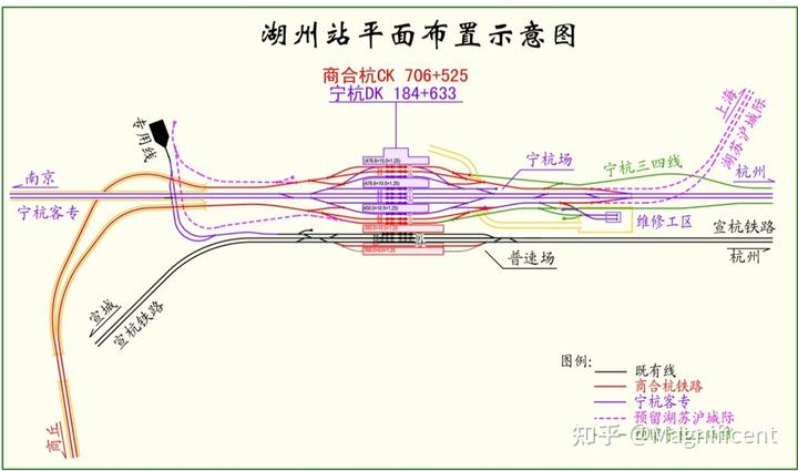 这时候就只能退而求其次,前往更北侧的位置寻找接入方法。此时整个商合杭工程所对应的“华东二通道”(淮南线~皖赣线~宣杭线)恰好在湖州有个 90°的拐点(正东改向正南)。于是为了配合之后的沪苏湖高铁,索性直接将湖州打造成一个枢纽,于是乎选择了在湖州接入既有杭宁高铁南下,也就是新闻中所述“湖州~杭州间与杭宁高铁共线”的由来。