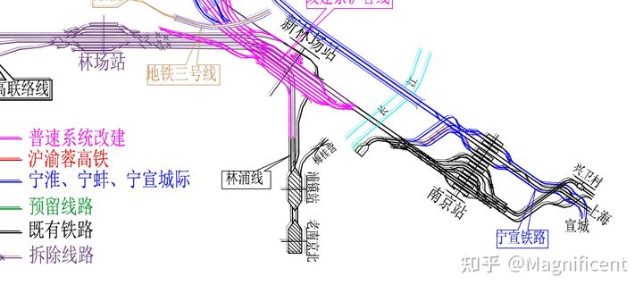 现如今南京枢纽对于宁启线的列车引入也采取了同样的方法:即既有林场 / 高里的大”Y“字疏解区将所有车流全部分摊至京沪线上,随后经京沪线前往南京站,与武汉类似,走既有线老桥:南京长江大桥过江。