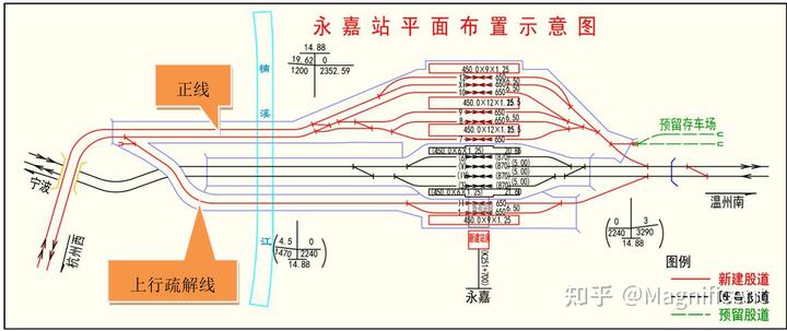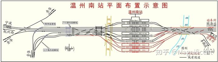 杭温的设计相对来讲比较一次到位:通过改造既有杭深线永嘉站(现温州北站)实现与杭深线的疏解。同时为了保证跨线效率,避免频繁出现切割正线问题,特意设计了一条疏解线。