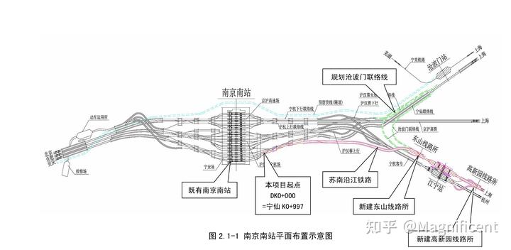 受“引入”思想较为严重的枢纽还有南京南。考虑到南京南为高架车站,能作线路拨接的地方较少,在充分研究后,得出了将南沿江高铁(沪宁沿江高铁)正线按线路别与仙宁线(联络线,但是车次不少)接入南京南宁安场东咽喉的方案。同时改造江宁站,正线设置高新园所接入江宁站,跨线列车借助杭宁高铁江宁⇌南京南所间杭宁高铁实现往宁蓉线、京沪高铁方向的跨线。