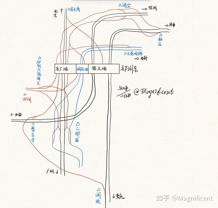 在郑州东的改造方案中,考虑到郑渝、郑济跨线车居多,与京广高铁的跨线可以通过北西疏解线(徐兰场 - 京广高铁马头岗所,仅下行)、郑渝郑州东上联线(阎块所 - 曹古寺所)、郑州东西北疏解线(曹古寺所 - 京广场)等线将车流疏解至较大的京广场。与京西标准经由(京广⇌徐兰)上下行经不同场站(下行徐兰场,上行京广场)类似,郑渝⇌京广的跨线在此基础上进一步延伸:下行叠加了切割郑渝上行正线,上行叠加了郑渝郑州东上联线。同样也是下行走徐兰场,上行走京广场。下行在徐兰场南咽喉切割郑渝正线并不要紧:因为疏解线已经将绝大部分终到 / 跨线车流引入了西侧的京广场,真正在徐兰场经停 / 终到的车并不多,因此并不存在很严重的敌对进路问题。