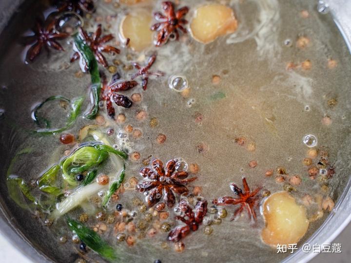 锅里加 1000ml 的清水,10 个八角,1 撮花椒 3 片姜 几根小葱煮沸后关火。