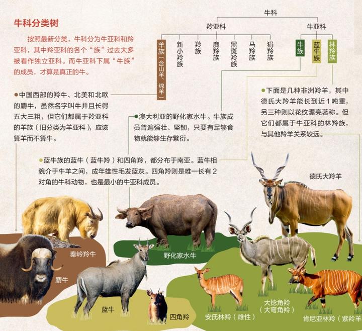 “牛科”这名字给人的感觉就像是:把鸟类和爬行类合并之后合称叫“鸟形纲”,其实从系统发育的角度讲,牛科应该叫“羚科”更合适,牛和羊都是特殊的“羚”,牛科的早期化石成员就是“羚”的外形,牛才是后来衍生的特例,现今的大多数牛科成员也都是“羚”,近些年有些书上还把羊亚科也并入了“羚亚科”。