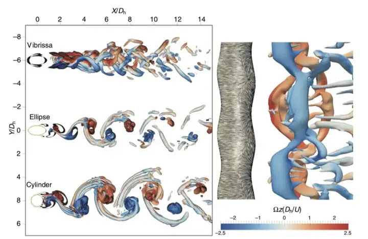 水流经过三种不同形状物体——港海豹胡须、椭圆柱体和圆柱体时形成的涡流差异。波浪状胡须通过打乱涡流群,让涡流形成更远,减少了振动 图片来源:参考文献[3]