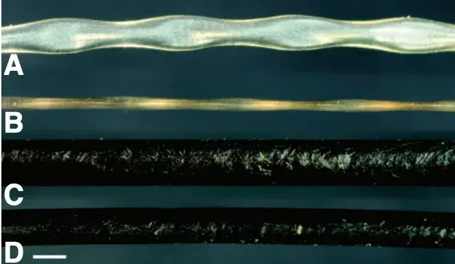 科学家们从自然死亡的幼年海豹和博物馆标本中取来三根港海豹胡须和三根加利福尼亚海狮胡须,长度相近。