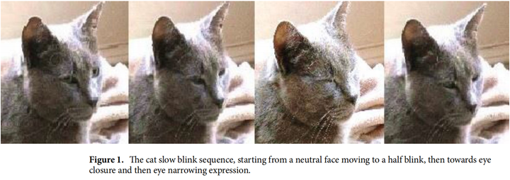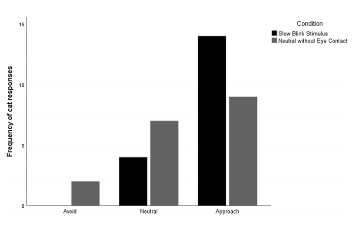 他们发现,当人类对猫缓慢眨眼(也就是眯起眼睛然后慢慢闭合再睁开)时,猫回以眨眼的频率显著高于无互动状态,而且更愿意主动靠近陌生人(下图)。
