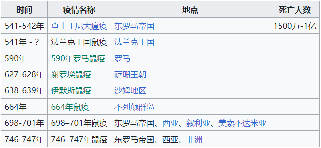 第一次鼠疫大流行(First Plague Pandemic),以 541 年查士丁尼大瘟疫作为开端,直至 750 年或 767 年才结束,断断续续发生了 15~18 波主要疫情。