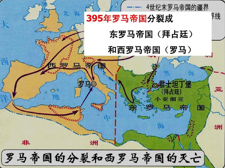 公元 395 年,古罗马帝国分裂成了西罗马帝国(395 年~476 年),以及东罗马的拜占庭帝国(395 年公元 1453 年)。