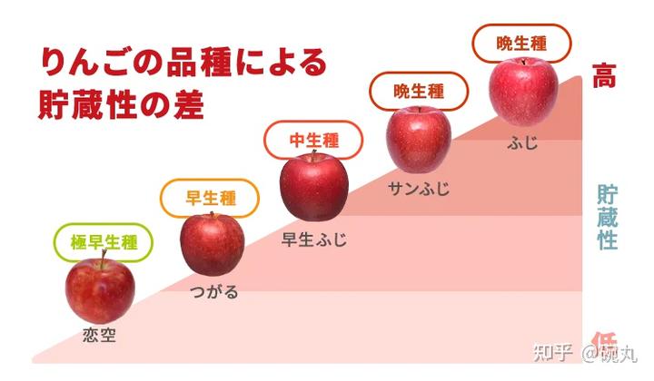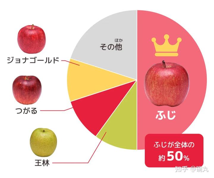 日本苹果大县青森县现在的主栽苹果品种是富士。乔纳金、津轻和王林的产量也很大。via:aomori-ringo.or.jp